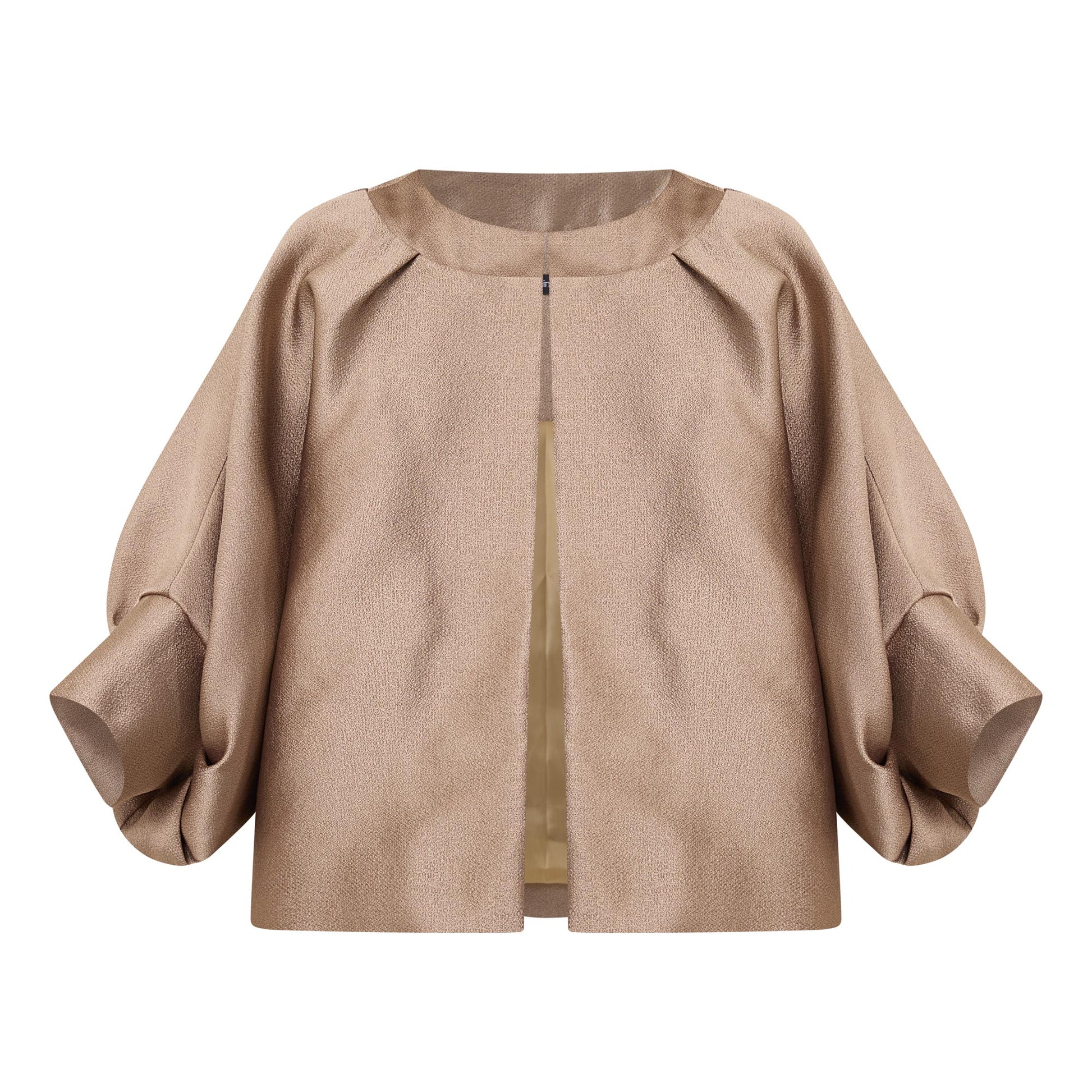 - Round neckline, long batwing sleeves, inverted back box pleat, short silhouette, textured finish